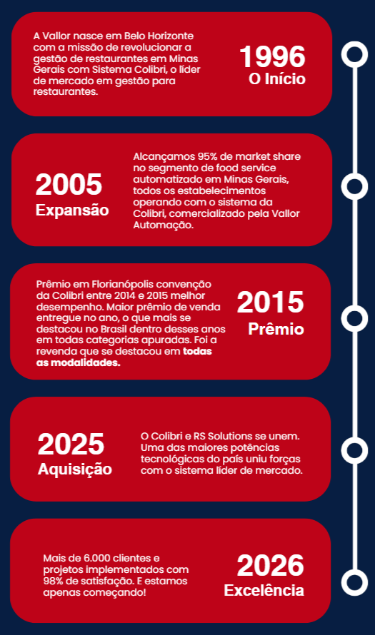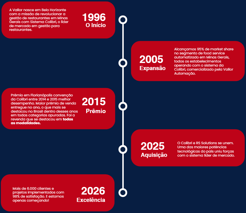 Em 1996 , a Vallor Soluções nasceu com um propósito que vai muito além de instalar sistemas. Nascemos para ser o parceiro estratégico que todo dono de restaurante em Minas Gerais gostaria de ter. Naquela época, a automação era um luxo; hoje, é uma necessidade. Mas uma coisa nunca mudou: nosso compromisso inabalável com o sucesso de cada cliente que confia em nosso trabalho.